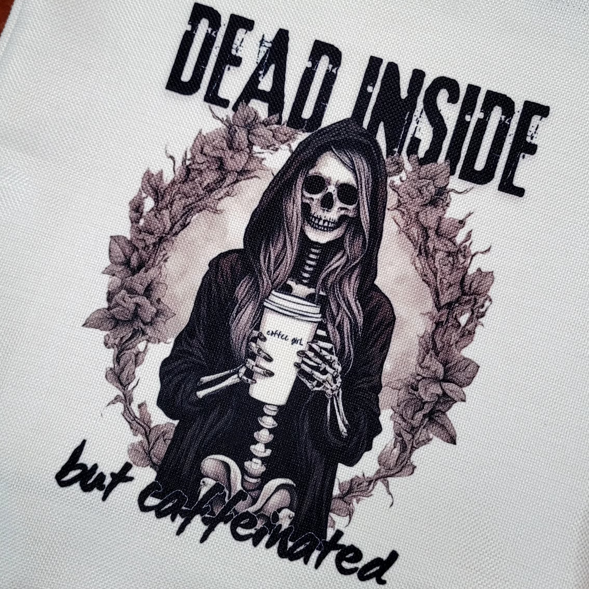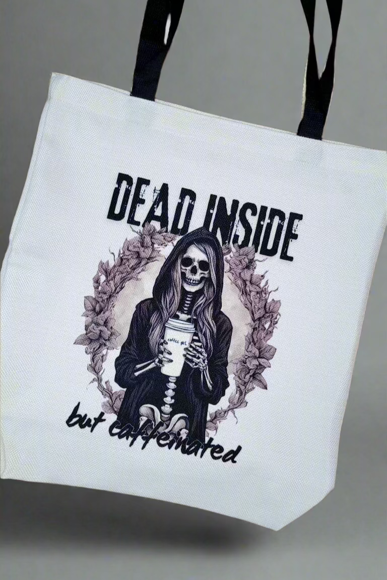 This bold and eye-catching tote features a coffee-loving skeleton design that will bring out your edgy side. Perfect for carrying all your essentials and adding a touch of daring to your everyday style. Take a chance and let your dead inside shine!
